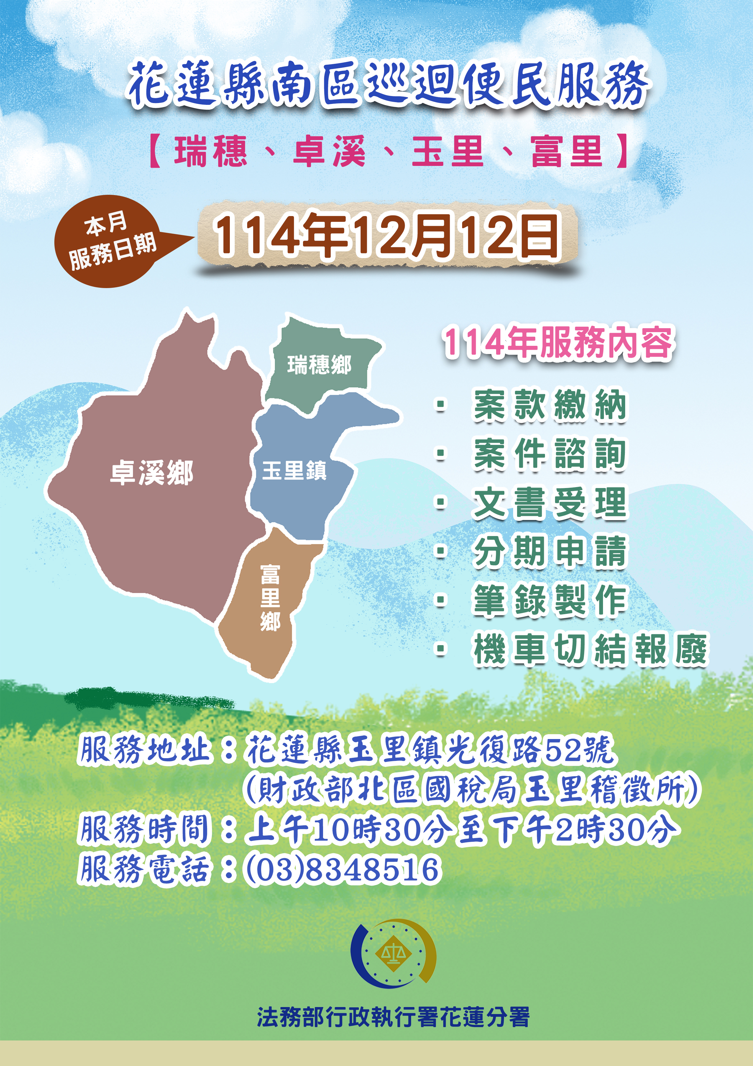 - 本分署花蓮縣南區巡迴便民服務站114年12月服務內容及日期,歡迎鄉親多加利用!!